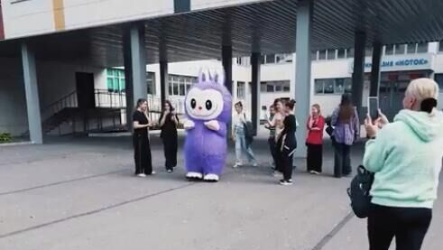 На кадрах видно, как Лабубу в школьном дворе угощает детей пирожками, фотографируется с ними и танцует.