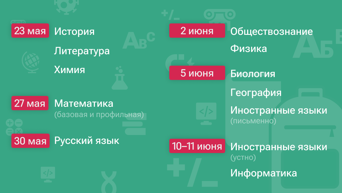 ЕГЭ по всем учебным предметам начинается в 10 часов утра по местному времени.График публикации результатов ЕГЭ